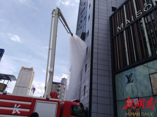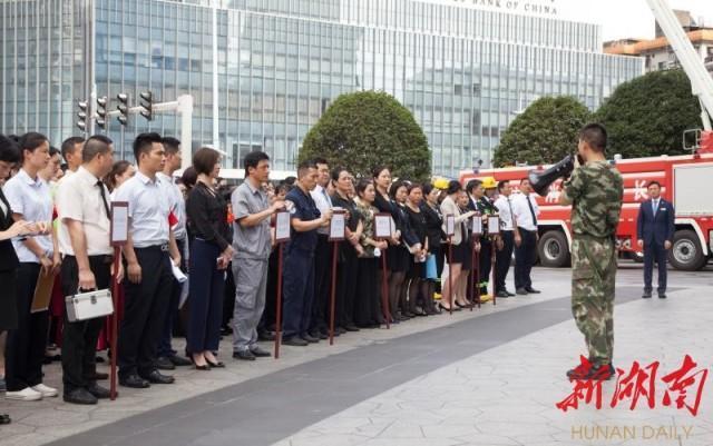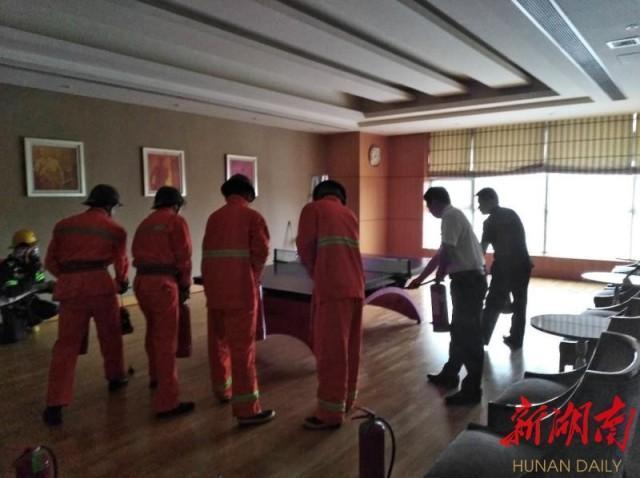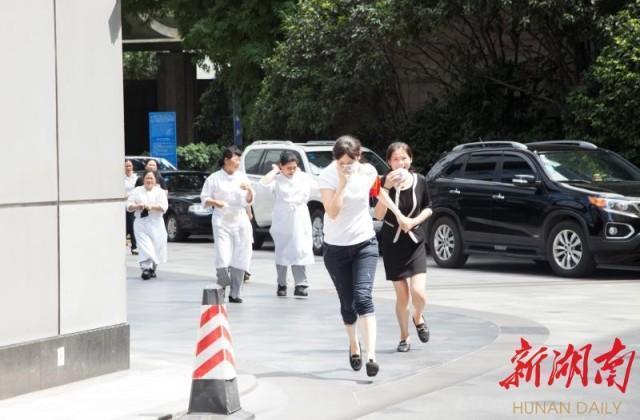 6月27日14:30分,演習正式開始。演習模擬長沙運達喜來登酒店六樓某營業(yè)區(qū)域因隨地丟棄的煙頭引發(fā)“火情”,火勢蔓延迅速。酒店安保部門接到報告后,立刻啟動火災(zāi)應(yīng)急預(yù)案,第一時間通知商場和寫字樓進行聯(lián)動處置,派出義務(wù)消防隊隊員到場處置火情,并迅速報警求援,組織酒店、商場和寫字樓內(nèi)的人員逃生。5分鐘后,長沙市消防支隊五一廣場中隊組織的消防車到場展開救援,用水炮、水槍配合控制大樓外立面火勢,消防員從樓中救出多名“受傷人員”。經(jīng)過20多分鐘的緊張救援,被困人員全部被疏散并安全轉(zhuǎn)移,“大火”也被成功撲滅。